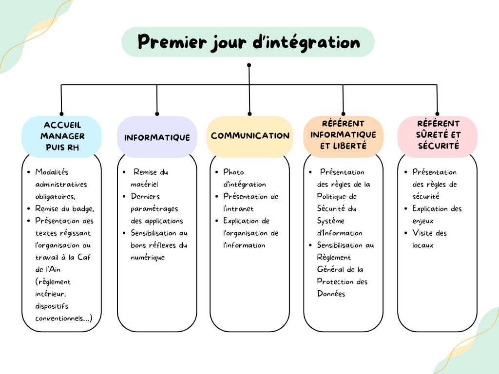 La durée de ce parcours est variable selon le service d’affectation et le nombre de personnes intégrées simultanément. Lors de la première journée, le nouveau salarié est d’abord accueilli par son manager direct. Puis, c’est au tour des services RH, informatique, communication, du Relais Informatique et Libertés et du Référent sureté et sécurité. La journée se termine enfin par une visite des locaux.